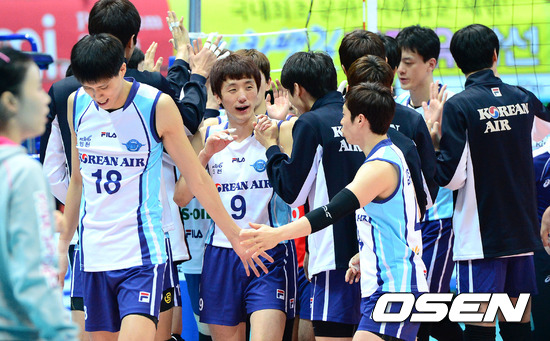 경기에 승리한 대한항공 선수들이 승리의 기쁨을 나누고 있다./sunday@osen.co.kr