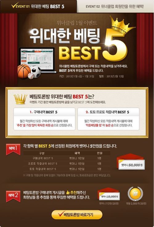 한편, 이번 이벤트에서는 위너클럽 회원만을 위한 혜택으로 1월 한달 간 최고의 분석가를 뽑는 ‘최고의 분석왕은 누구?’ 를 동시에 진행한다. 이벤트 기간 동안 리그집중분석에 토토와 프로토 대상경기 분석글을 작성하는 회원을 대상으로 진행되는 이번 이벤트는 게임별 분석랭킹 상위 20명을 선정해 벳머니를 증정한다.