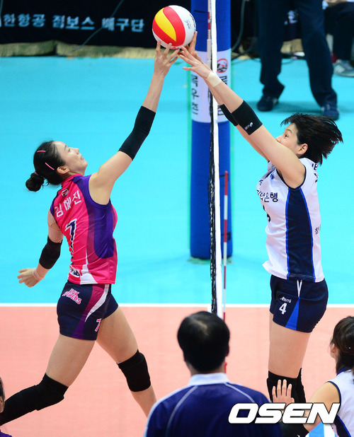 27일 오후 인천 도원체육관에서 열린 '2012-2013 NH농협 V-리그' 여자부 흥국생명과 IBK기업은행의 경기, 2세트 기업은행 김희진이 흥국생명 김헤진의 공격을 블로킹 하고 있다.