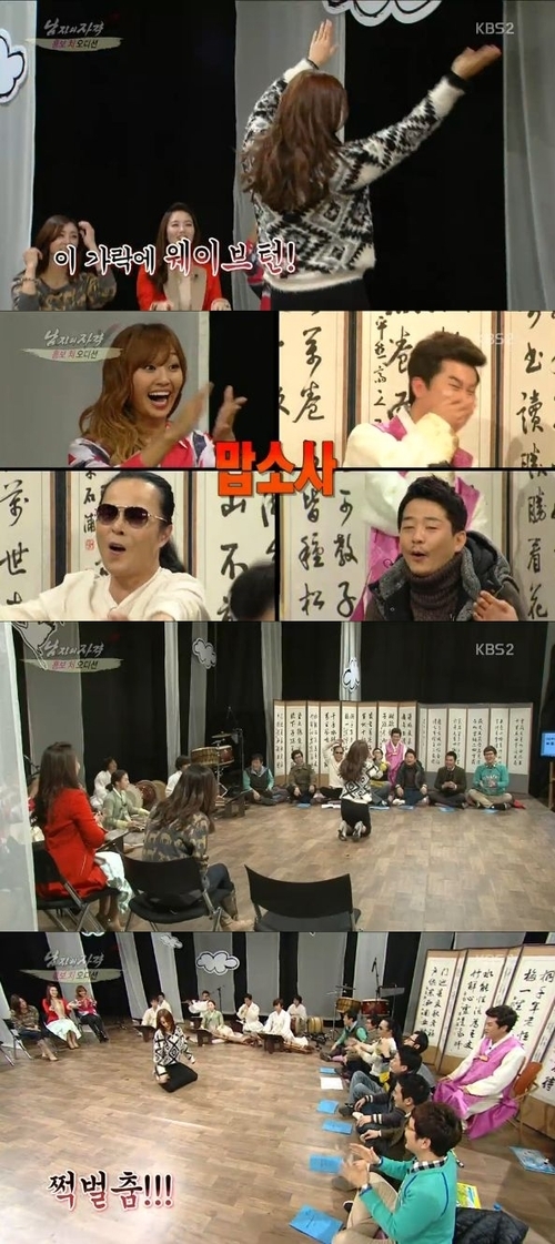 앞서 효린과 가애란 아나운서의 춤을 본 백지영은 이에 질세라 국악에 맞춰 팔동작을 흔들며 웨이브를 선보였다. 분위기가 달아오르자 그는 바닥에 앉아 쩍벌춤을 췄고, 이를 지켜본 '남격' 멤버들은 깜짝 놀라며 환호성을 질렀다.