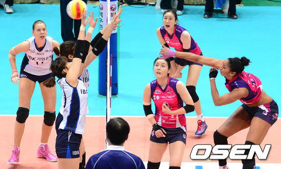 2세트 흥국생명 휘트니가 IBK 기업은행의 블로킹 벽을 피해 스파이크를 날리고 있다./sunday@osen.co.kr