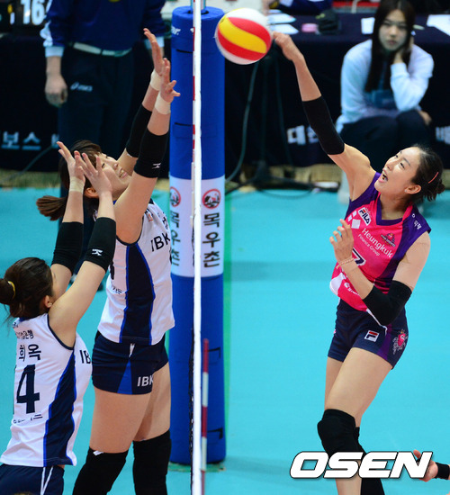 2세트 흥국생명 김헤진이 기업은행의 블로킹 벽을 피해 스파이크를 날리고 있다./sunday@osen.co.kr