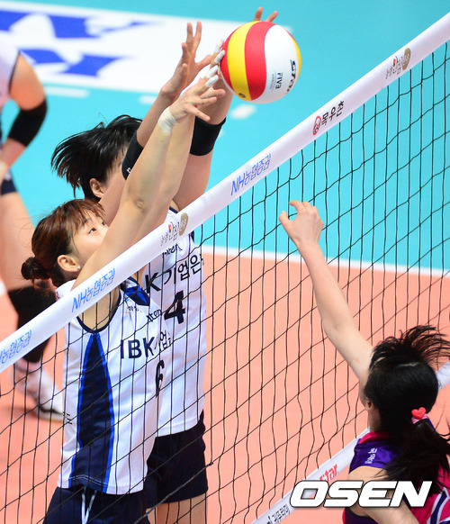 2세트 기업은행 이소진과 김희진이 흥국생명 주예나의 공격을 블로킹 하고 있다./sunday@osen.co.kr