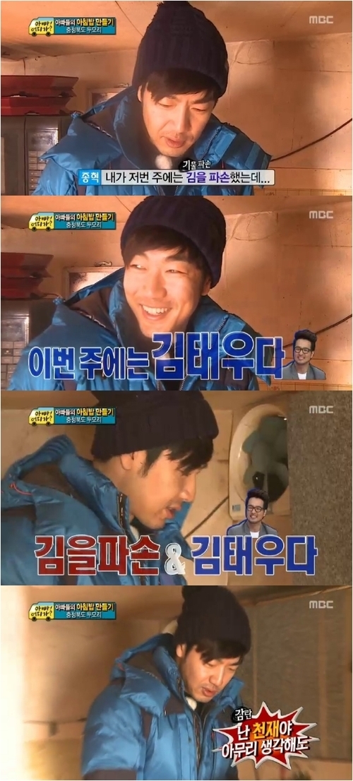 이종혁은 27일 방송된 MBC 예능프로그램 ‘일밤-아빠 어디가’ 4회에서 아들 이준수를 위해 아침밥을 하던 중 김을 태웠다. 지난 방송에서 김을 태운 후 “김을파손(기물파손)”이라고 말장난을 했던 그는 이번에는 “김태우다”라고 가수 김태우의 이름을 이용한 말장난을 했다.