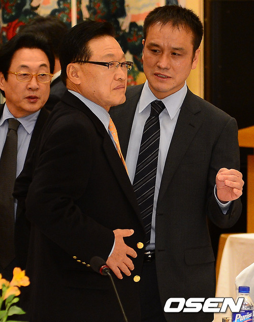 조중연 회장이 김주성 사무총장과 총회에 앞서 이야기를 나누고 있다.