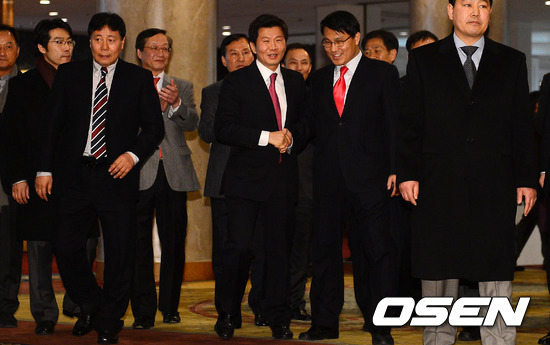 대한축구협회장으로 당선된 정몽규 후보가 윤상현 후보의 축하를 받으며 총회장으로 이동하고 있다.