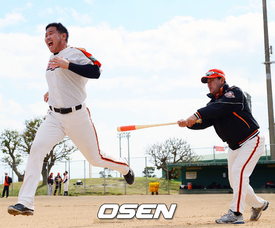 28일 일본 오키나와 고친다 구장에서 진행된 한화 이글스 2013 오키나와 전지훈련에서 김성한 수석코치가 배트를 휘두르며 최승환 포수를 달리게 하고 있다.
