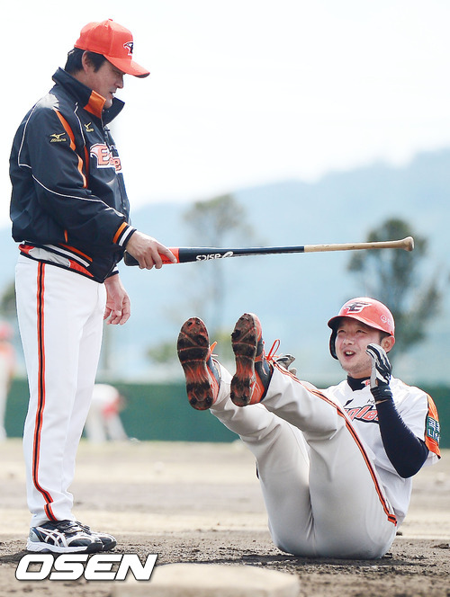 28일 일본 오키나와 고친다 구장에서 진행된 한화 이글스 2013 오키나와 전지훈련에서 이종범 코치가 전현태에게 기합을 주고 있다.