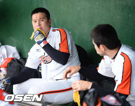 28일 일본 오키나와 고친다 구장에서 진행된 한화 이글스 2013 오키나와 전지훈련에서 이대수와 한상훈이 바나나를 먹고 있다.