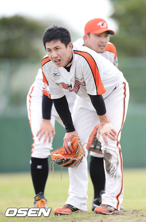 28일 일본 오키나와 고친다 구장에서 진행된 한화 이글스 2013 오키나와 전지훈련에서 오재필과 김태완이 수비훈련을 하며 숨을 고르고 있다.
