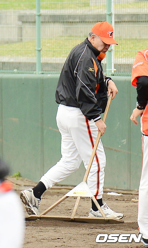 28일 일본 오키나와 고친다 구장에서 진행된 한화 이글스 2013 오키나와 전지훈련에서 김응룡 감독이 긁개로 그라운드를 고르게 하고 있다.