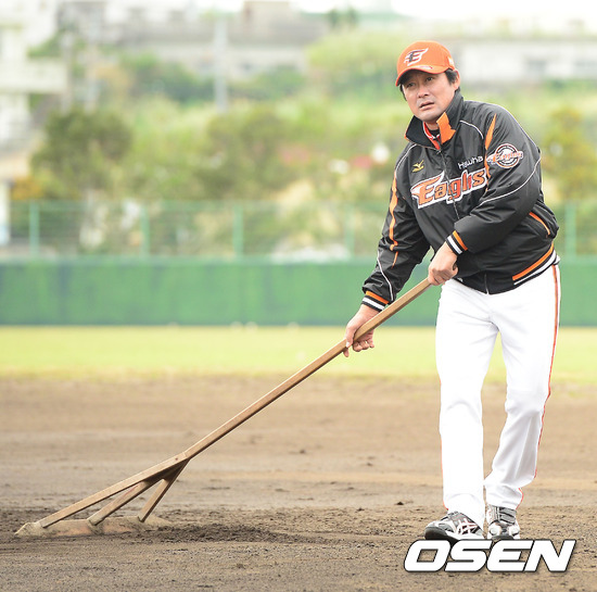 28일 일본 오키나와 고친다 구장에서 진행된 한화 이글스 2013 오키나와 전지훈련에서 이종범 코치가 긁개로 그라운드를 고르게 하고 있다.
