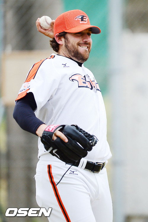 28일 일본 오키나와 고친다 구장에서 진행된 한화 이글스 2013 오키나와 전지훈련에서 이브랜드가 캐치볼을 하고 있다.