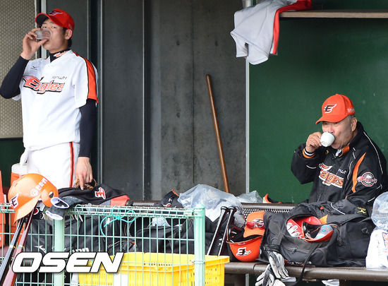 28일 일본 오키나와 고친다 구장에서 진행된 한화 이글스 2013 오키나와 전지훈련에서 하주석과 김응룡 감독이 각각 물과 커피를 마시고 있다.