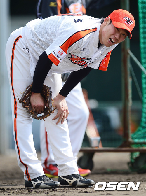 28일 일본 오키나와 고친다 구장에서 진행된 한화 이글스 2013 오키나와 전지훈련에서 하주석이 숨을 고르고 있다.