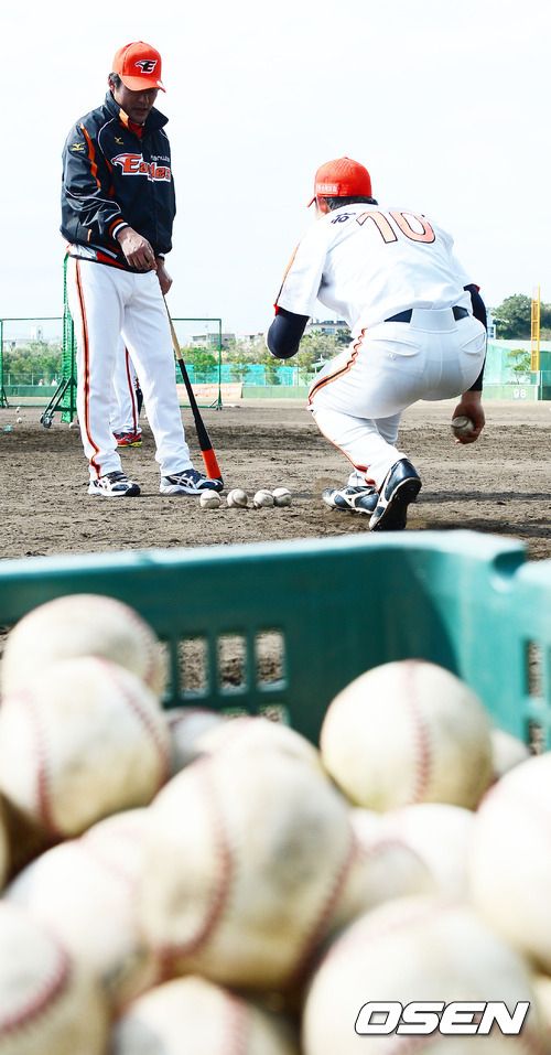 28일 일본 오키나와 고친다 구장에서 진행된 한화 이글스 2013 오키나와 전지훈련에서 이종범 코치가 하주석에게 오리걸음으로 공 옮기기를 시키고 있다.