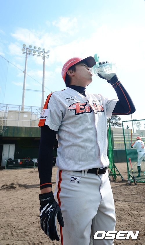 28일 일본 오키나와 고친다 구장에서 진행된 한화 이글스 2013 오키나와 전지훈련에서 오선진이 물을 마시고 있다.
