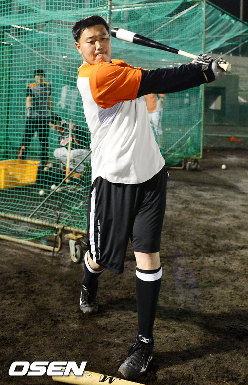 28일 일본 오키나와 고친다 구장에서 진행된 한화 이글스 2013 오키나와 전지훈련에서 야간훈련 중 최승환이 스윙을 하고 있다.