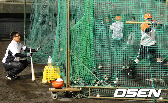28일 일본 오키나와 고친다 구장에서 진행된 한화 이글스 2013 오키나와 전지훈련에서 야간훈련 중 김태균이 그물망 뒤에서 포수자세를 취하고 있다.
