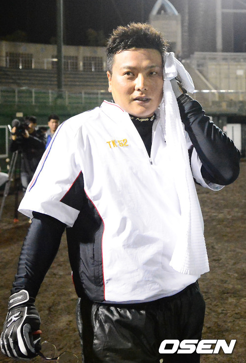 28일 일본 오키나와 고친다 구장에서 진행된 한화 이글스 2013 오키나와 전지훈련에서 야간훈련 중 김태균이 땀을 닦고 있다.