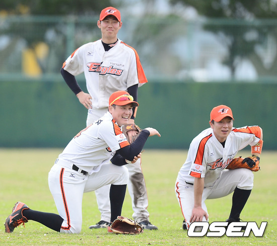 28일 일본 오키나와 고친다 구장에서 진행된 한화 이글스 2013 오키나와 전지훈련에서 수비 훈련 중 실수가 나오자 이대수 하주석 백승룡이 미소짓고 있다.