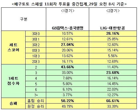 대한항공의 승리 예상은 33.39%로 나타났고, 최종 세트스코어에서는 3-0 LIG 승리(28.16%) 예상이 가장 높게 나타났다. 또 1세트 점수차 예상에서는 3점차(23.68%)가 1순위로 집계됐다.