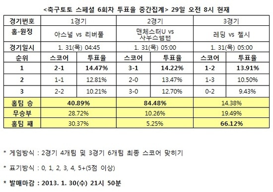 이번 축구토토 스페셜 6회차는 30일 밤 9시 50분에 발매가 마감되며, 경기가 모두 종료된 후 결과가 발표된다.