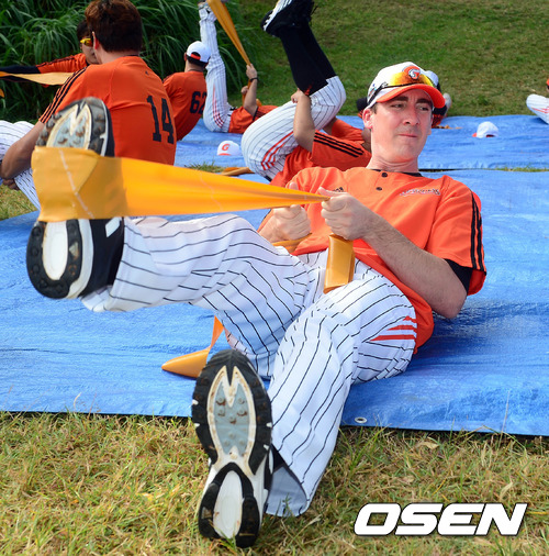 29일 오전(현지시간) 사이판 롯데 전지훈련장에서 새 용병 리치몬드가 스트레칭을 하고 있다.