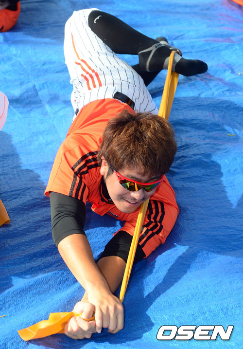29일 오전(현지시간) 사이판 롯데 전지훈련장에서 강민호가 스트레칭을 하고 있다.
