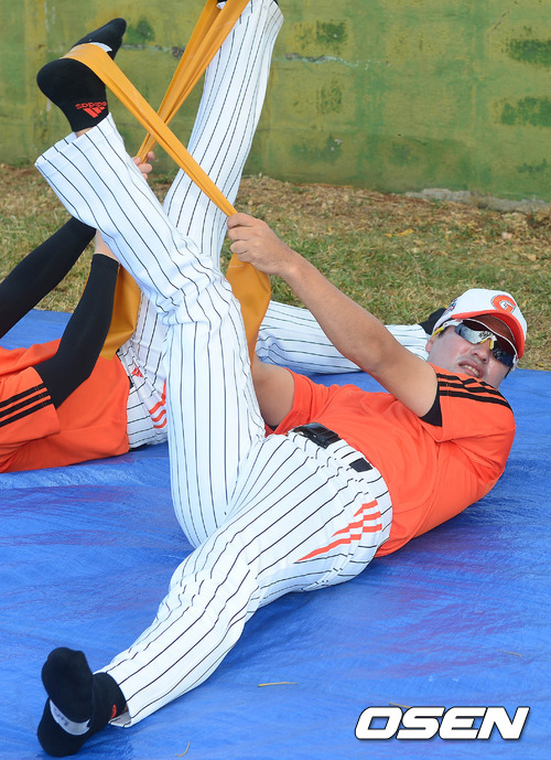 29일 오전(현지시간) 사이판 롯데 전지훈련장에서 이정민이 스트레칭을 하고 있다.