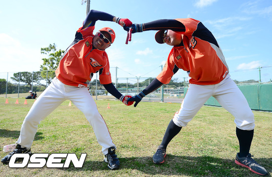 29일 일본 오키나와 고친다 구장에서 진행된 한화 이글스 2013 오키나와 전지훈련에서 조청희 트레이닝 코치와 송창식이 카메라 앞에서 포즈를 취하고 있다.