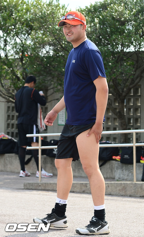 29일 일본 오키나와 고친다 구장에서 진행된 한화 이글스 2013 오키나와 전지훈련에서 안승민이 취재진에게 허벅지를 보이고 있다.