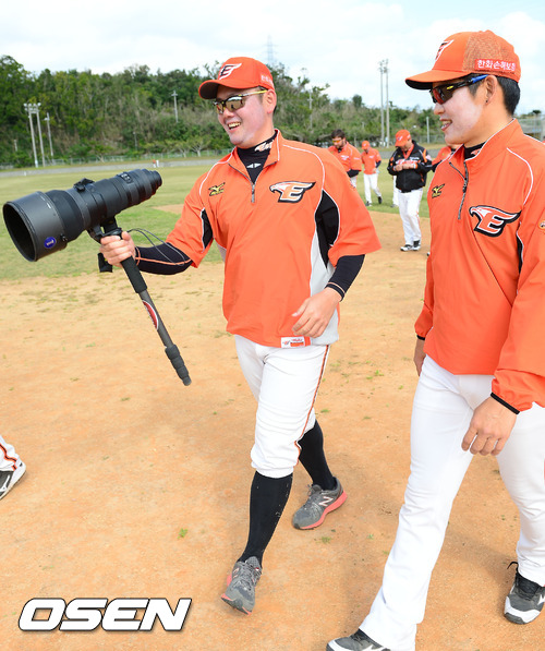 29일 일본 오키나와 고친다 구장에서 진행된 한화 이글스 2013 오키나와 전지훈련에서 송창식과 박정진이 취재진의 카메라 렌즈를 살펴보고 있다.
