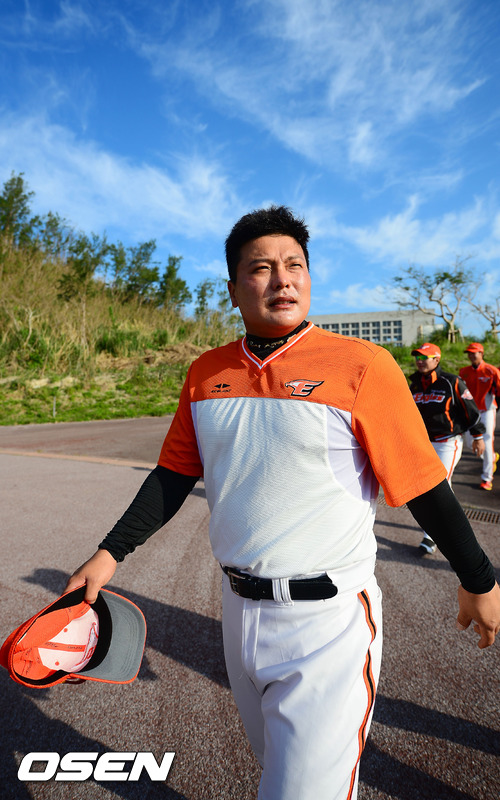29일 일본 오키나와 고친다 구장에서 진행된 한화 이글스 2013 오키나와 전지훈련에서 김태균이 다음 훈련장으로 이동하고 있다.