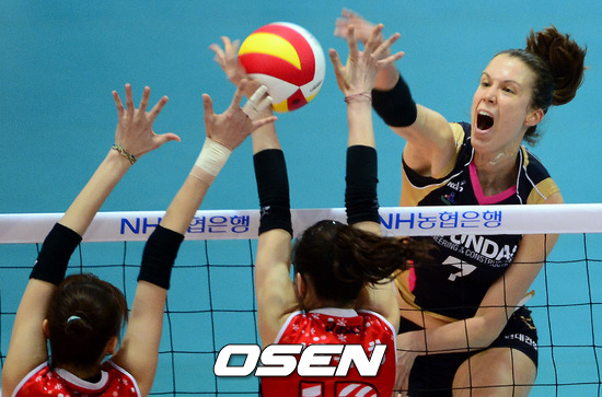 29일 오후 수원 실내체육관에서 열린 '2012-2013 NH농협 V-리그' 여자부 현대건설과 KGC인삼공사의 경기, 2세트 현대건설 야나가 KGC 김은영과 최수빈의 블로킹을 앞에두고 공격을 시도하고 있다.