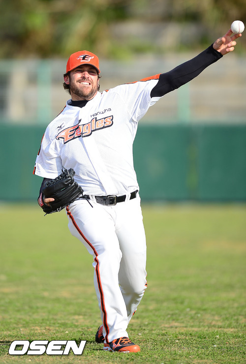29일 일본 오키나와 고친다 구장에서 진행된 한화 이글스 2013 오키나와 전지훈련에서 이브랜드가 힘차게 공을 뿌리고 있다.