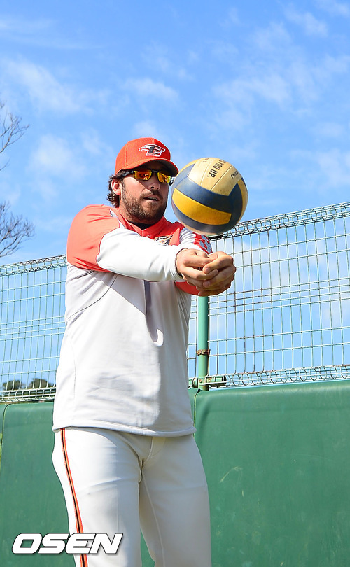 29일 일본 오키나와 고친다 구장에서 진행된 한화 이글스 2013 오키나와 전지훈련에서 이브랜드가 취재진에게 토스동작을 선보이고 있다.