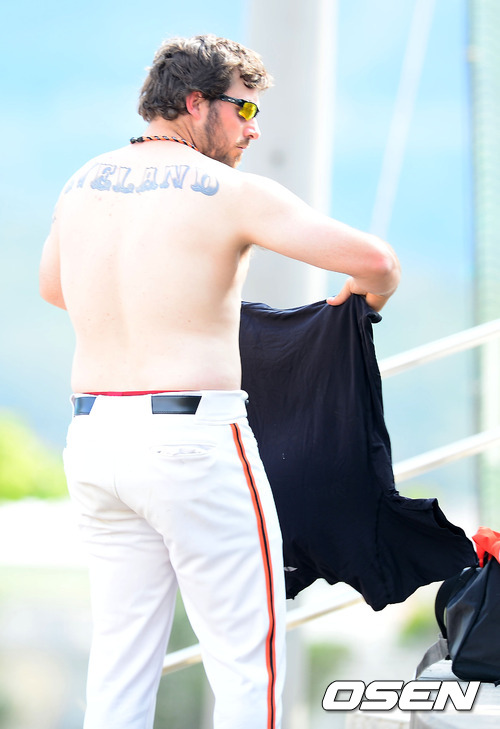 29일 일본 오키나와 고친다 구장에서 진행된 한화 이글스 2013 오키나와 전지훈련에서 이브랜드가 유니폼을 갈아입고 있다.
