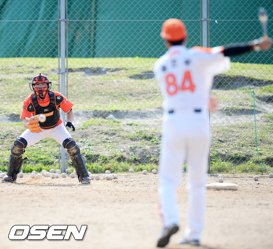 29일 일본 오키나와 고친다 구장에서 진행된 한화 이글스 2013 오키나와 전지훈련에서 한화 송진우 투수코치가 이충호 투수에게 포수 복장을 하게 하고 펑고를 쳐주고 있다.