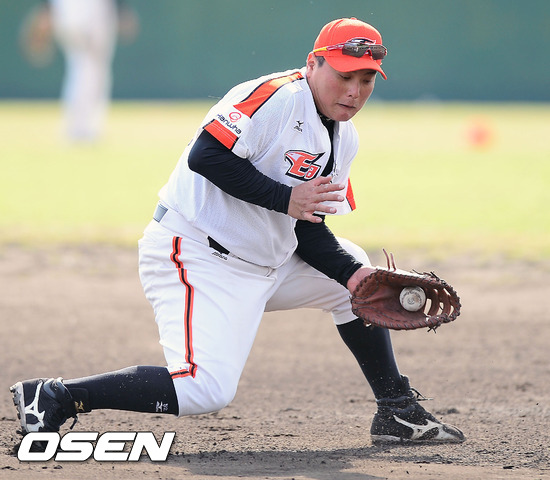 29일 일본 오키나와 고친다 구장에서 진행된 한화 이글스 2013 오키나와 전지훈련에서 한화 김태균이 수비훈련중 불규칙 바운드볼을 잡으며 놀라고 있다.