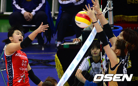 경기 1세트 KGC 최수빈이 자신이 때린 스파이크가 현대건설 황연주의 블로킹에 걸려 득점에 실패하고 있다. / youngrae@osen.co.kr