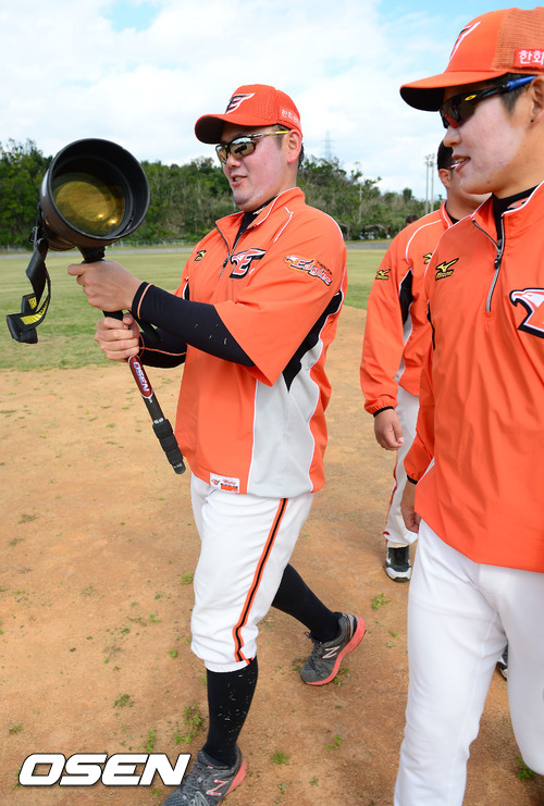 29일 일본 오키나와 고친다 구장에서 진행된 한화 이글스 2013 오키나와 전지훈련에서 송창식과 박정진이 취재진의 카메라 렌즈를 살펴보고 있다.
