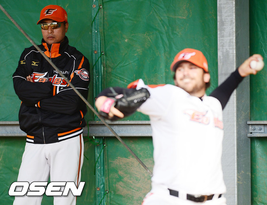 29일 일본 오키나와 고친다 구장에서 진행된 한화 이글스 2013 오키나와 전지훈련에서 송진우 투수코치가 이브랜드의 불펜피칭을 지켜보고 있다.