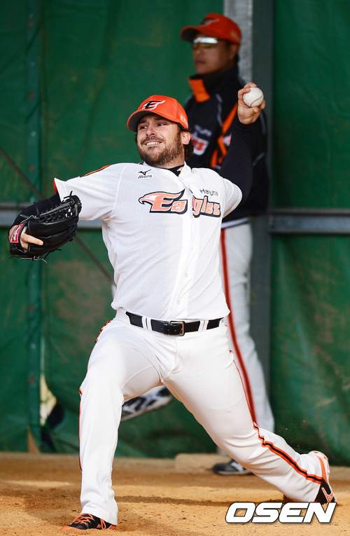 29일 일본 오키나와 고친다 구장에서 진행된 한화 이글스 2013 오키나와 전지훈련에서 이브랜드가 송진우 투수 코치 앞에서 불펜피칭을 하고 있다.
