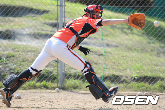 29일 일본 오키나와 고친다 구장에서 진행된 한화 이글스 2013 오키나와 전지훈련에서 한화 이충호 투수가 포수 복장을 하고 특수 훈련을 받고 있다.