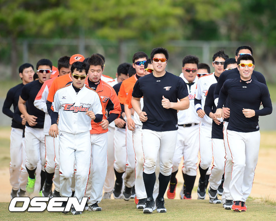 29일 일본 오키나와 고친다 구장에서 진행된 한화 이글스 2013 오키나와 전지훈련에서 한화 야수들이 군가 '멋진 사나이'를 부르며 러닝 훈련을 하고 있다.