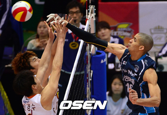 29일 오후 수원 실내체육관에서 열린 '2012-2013 NH농협 V-리그' 남자부 KEPCO와 삼성화재의 경기, 2세트 삼성화재 레오가 네트 플레이로 득점을 올리고 있다.