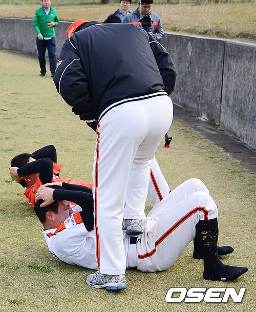29일 일본 오키나와 고친다 구장에서 진행된 한화 이글스 2013 오키나와 전지훈련에서 한화 이여상이 훈련을 할때 김성한 수석코치가 이여상의 배를 밟아보고 있다.