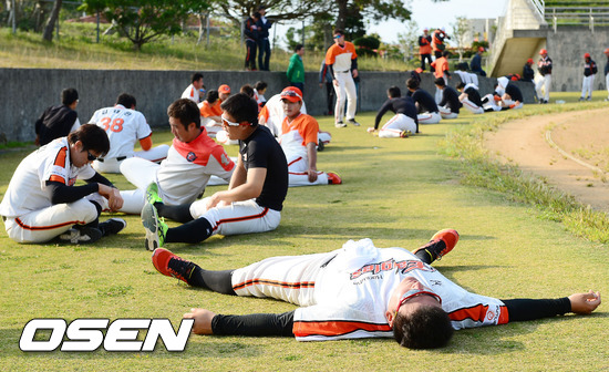 29일 일본 오키나와 고친다 구장에서 진행된 한화 이글스 2013 오키나와 전지훈련에서 러닝훈련을 마친 야수들이 휴식을 취할때 김태균이 그대로 누워있다.