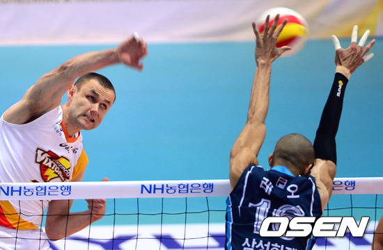 29일 오후 수원 실내체육관에서 열린 '2012-2013 NH농협 V-리그' 남자부 KEPCO와 삼성화재의 경기, 2세트 KEPCO 안젤코가 삼성화재 레오를 앞에두고 스파이크를 때리고 있다.